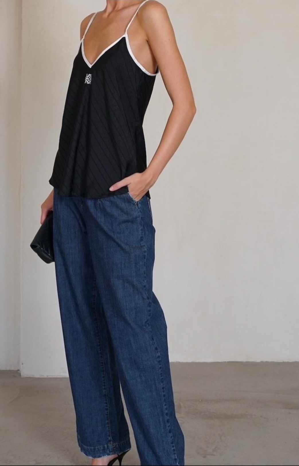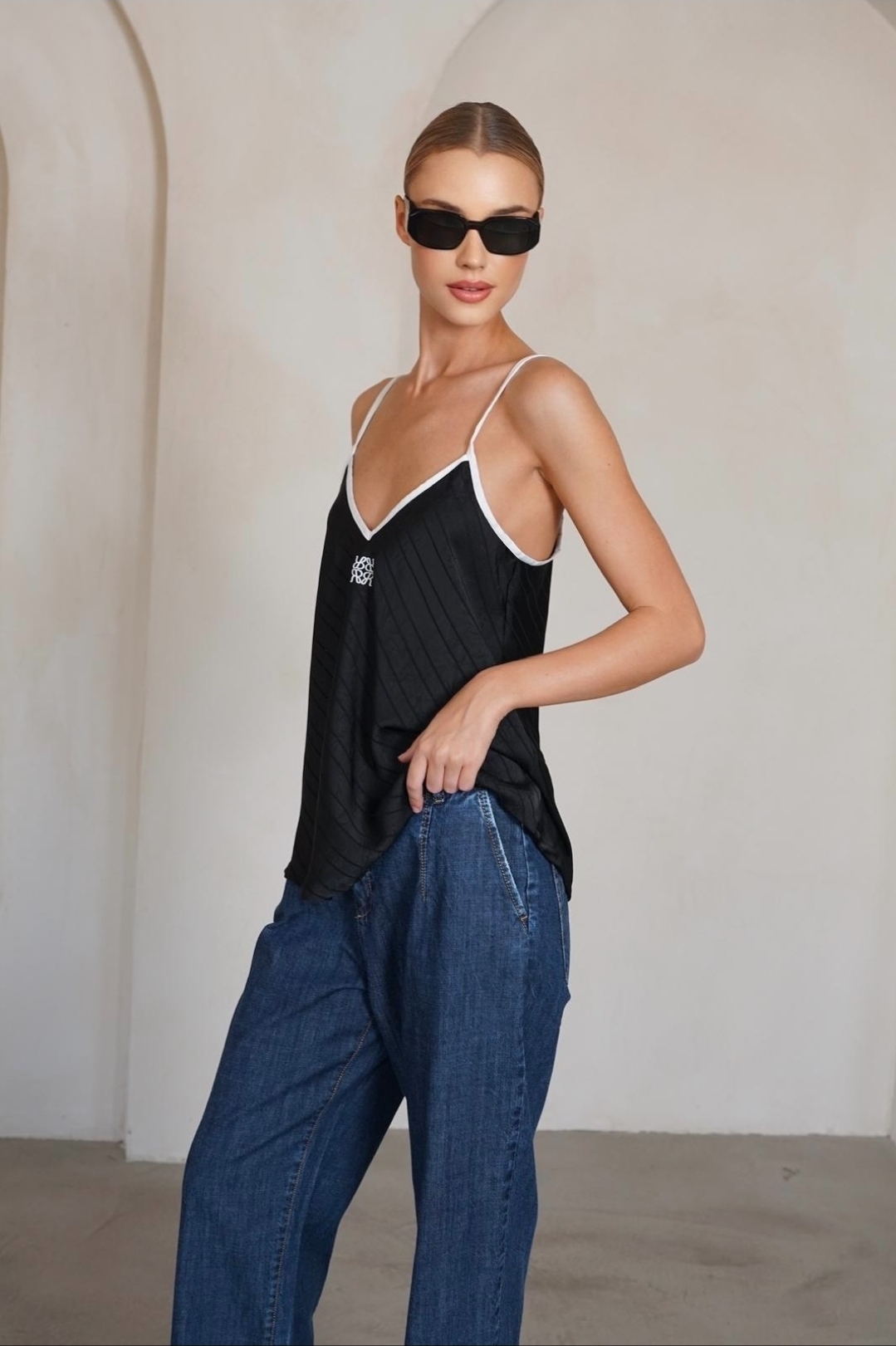 גופיה בגזרת A מתרחבת מעט בחלק התחתון עם פסי אורך דקיקים תיפור קונטרסטי במחשוף סיומת לבנה ובולטת בפתח הצוואר והכתפיות כתפיות ספגטי דקות