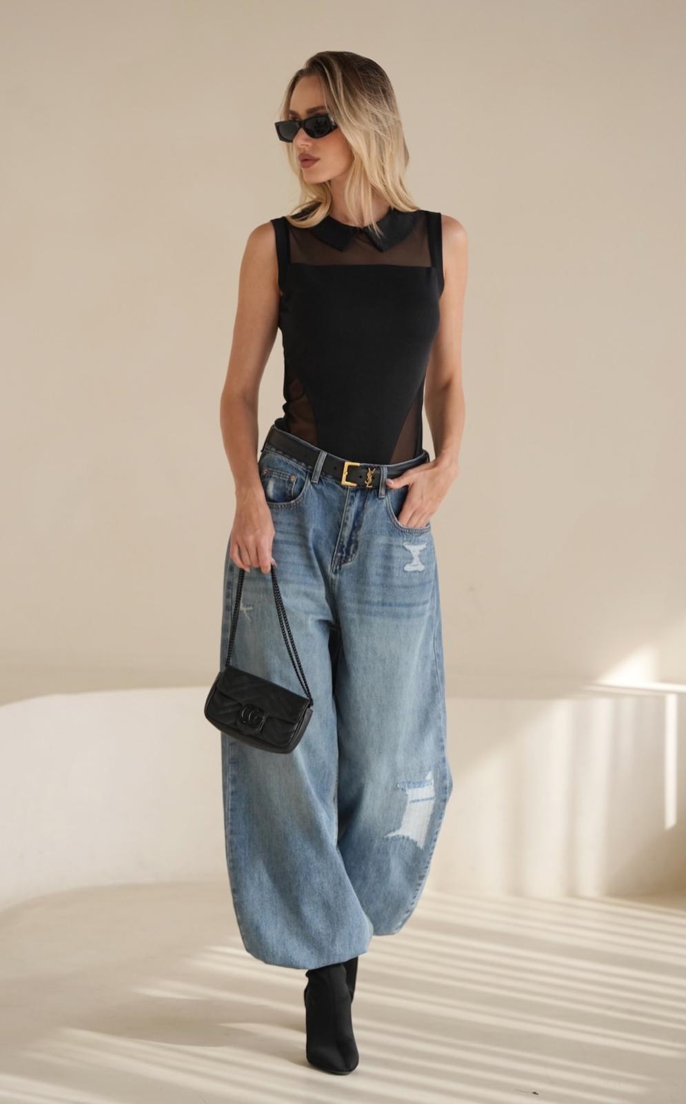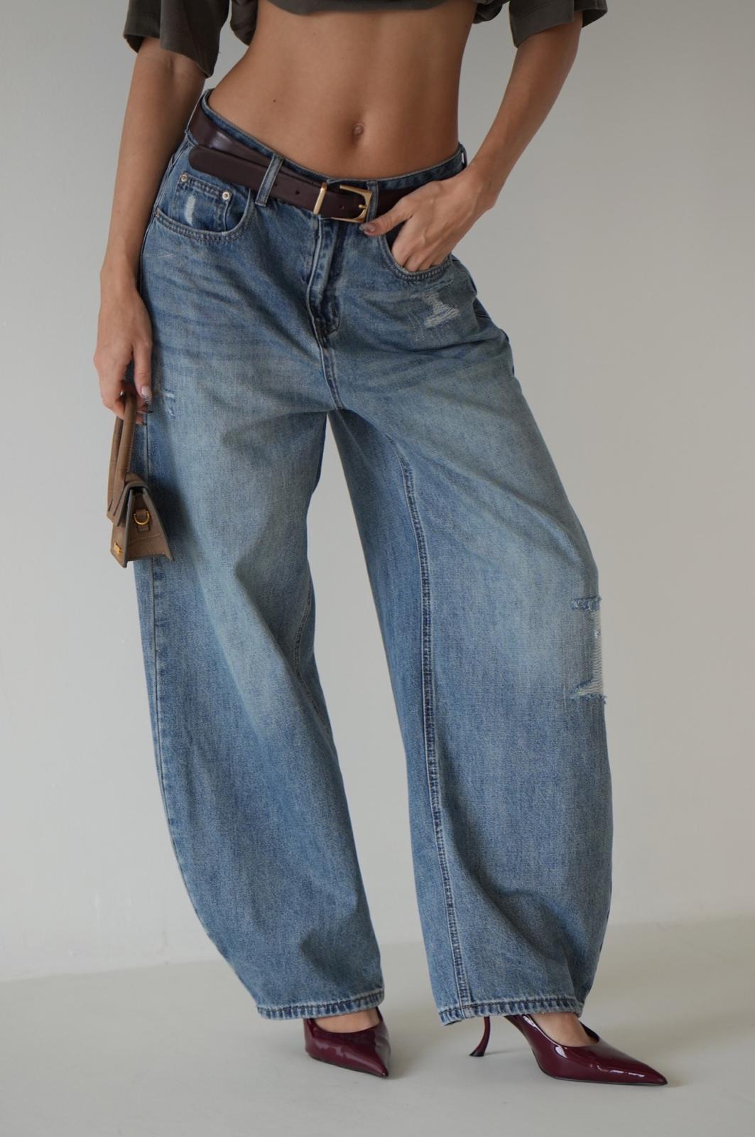ג'ינס מבית " אנטיגו " בגזרת אוברסייז רחבה תיפורים לאורך הרגל לצד שפשופים וקרעים עדינים