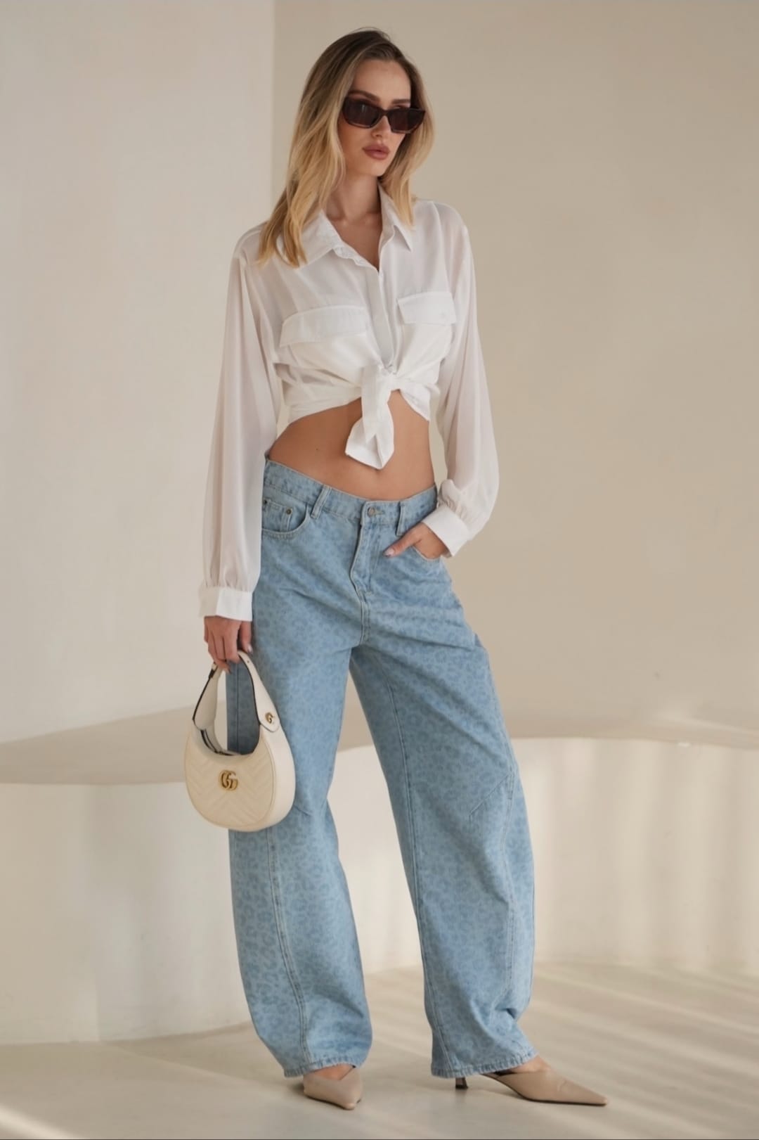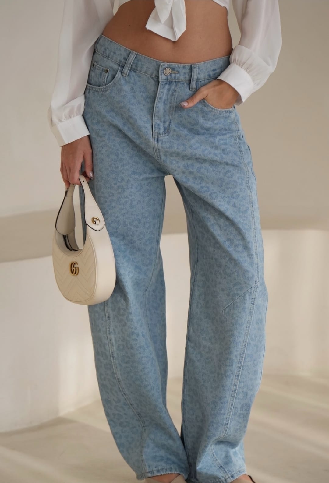 ג'ינס מבית " אנטיגו " בגזרה רחבה ומשוחררת בהדפס חייתי עדין שמשולב בתוך הג'ינס