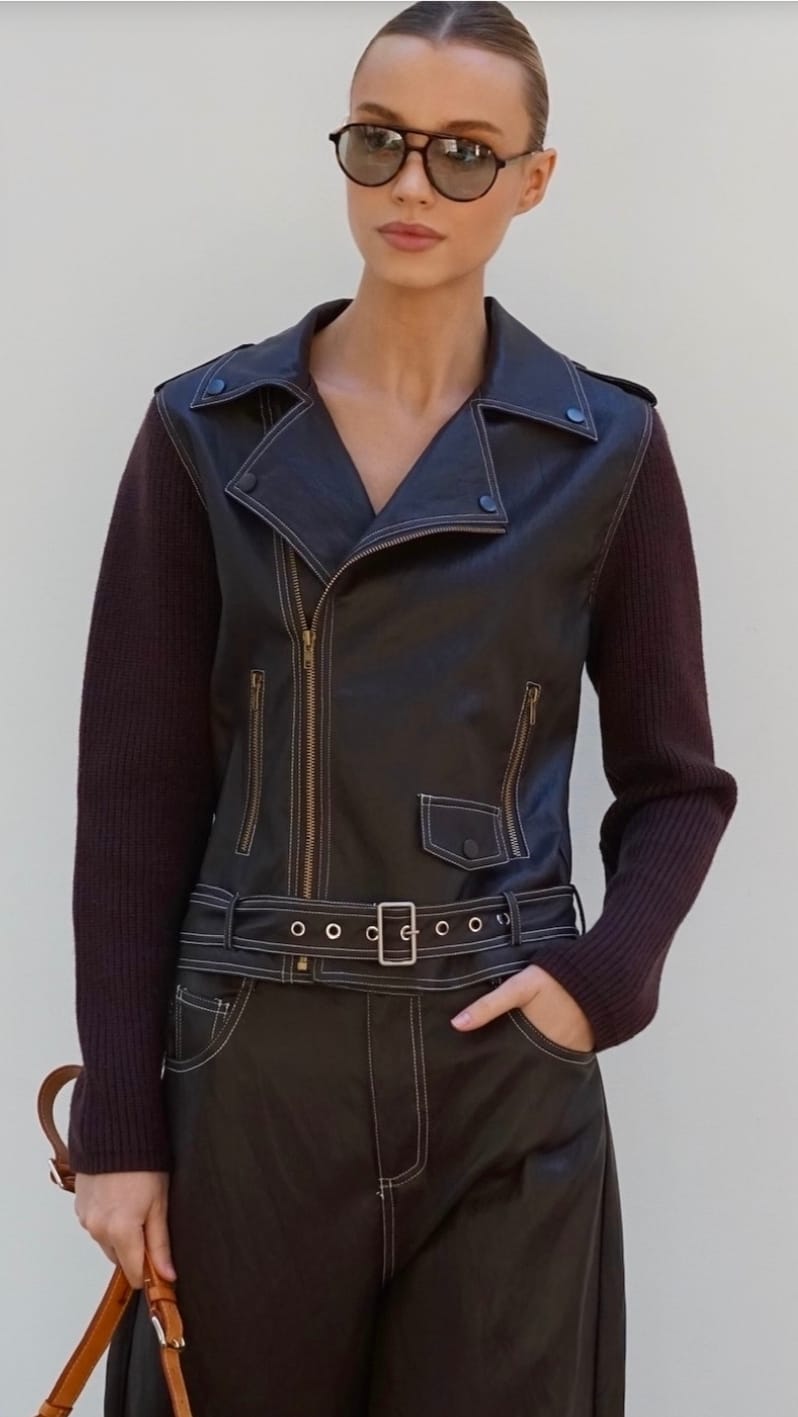 ג'קט מבד דמוי עור עם שרוולים בשילוב בד סרוג סגירת רוכסן