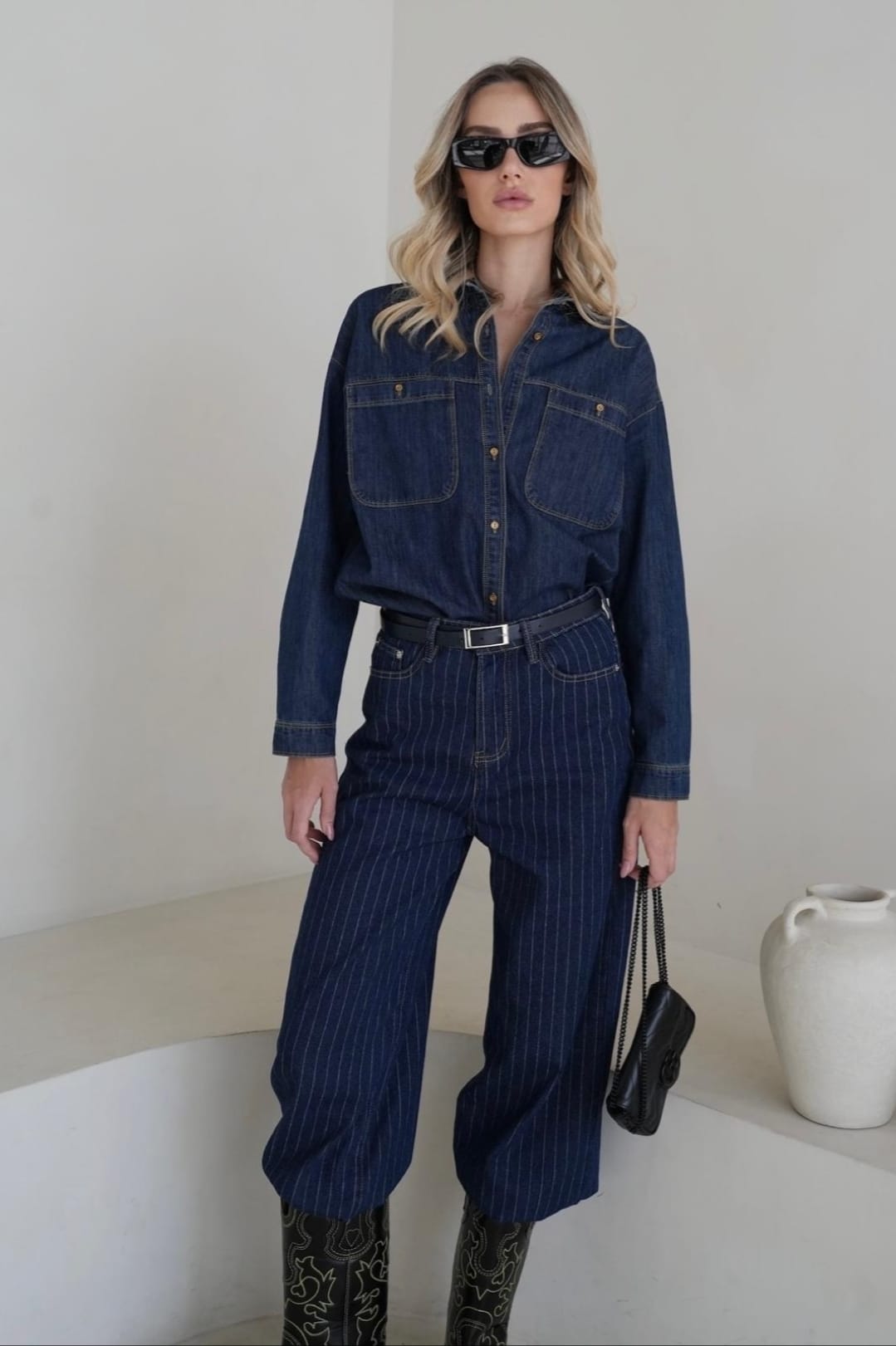 חולצת ג'ינס כהה עם תיפורים בולטים