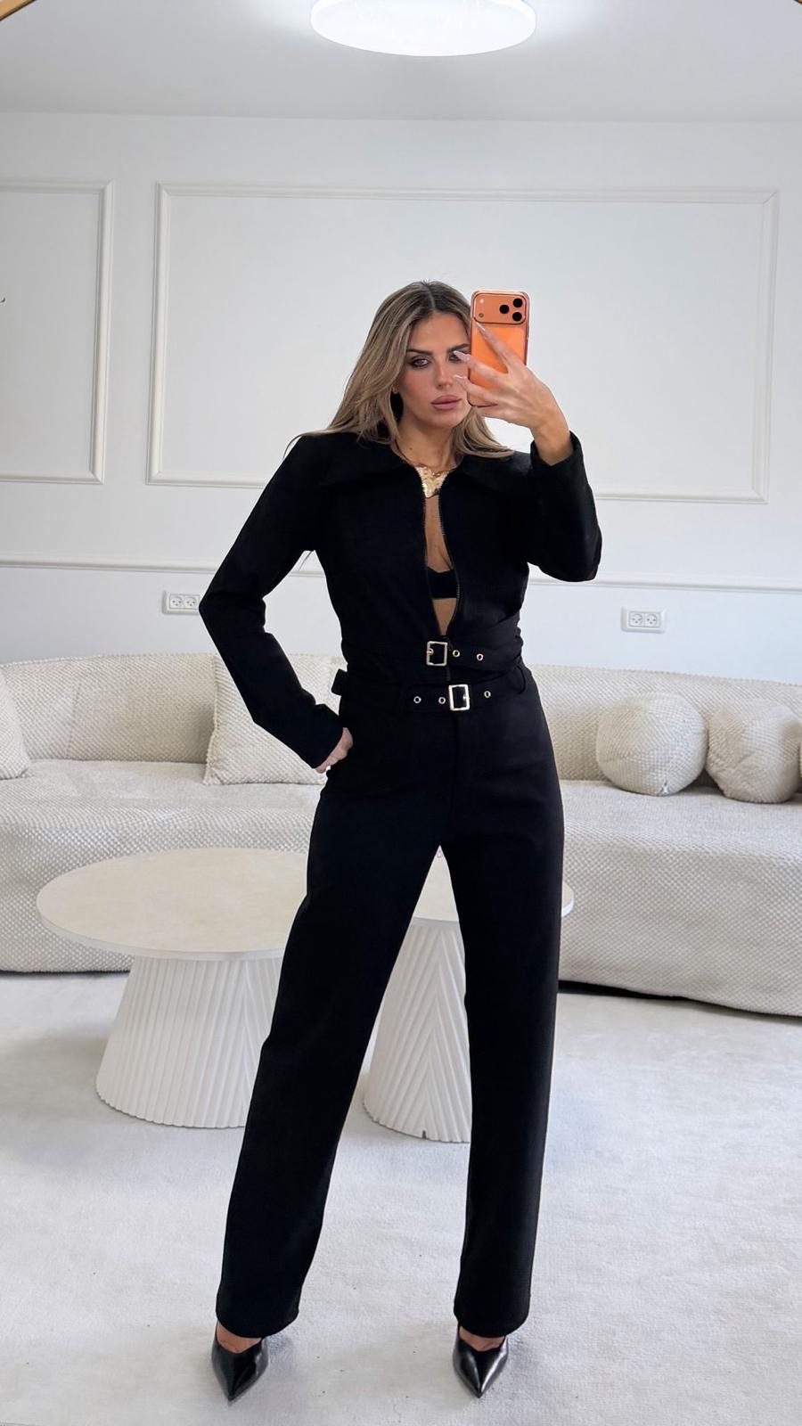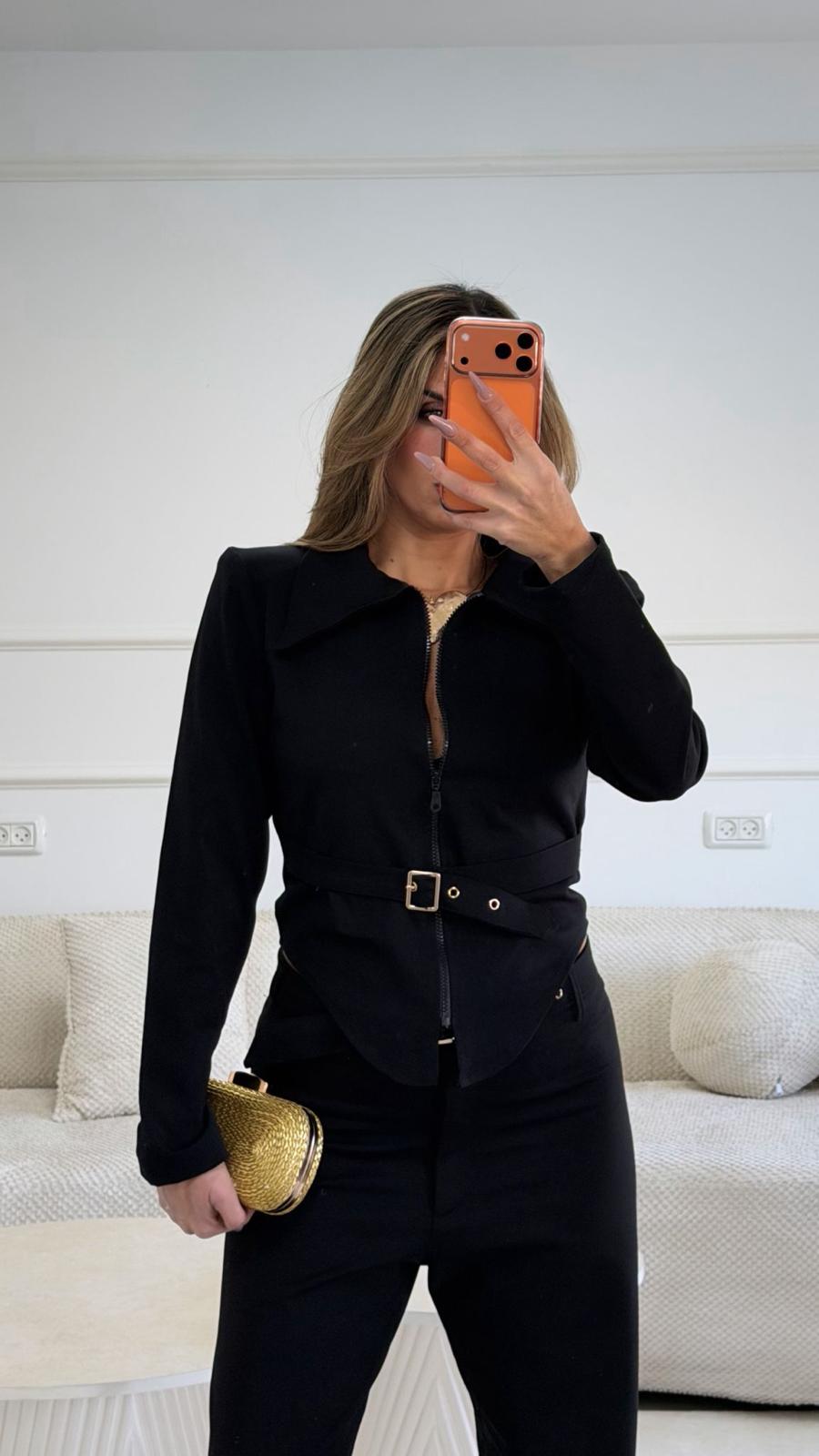 ג'קט חולצה מבד לייקרה עבה מחטב רכיסת רוכסן מלפנים וצווארון בשילוב חגורה תואמת מידה: וואן סייז