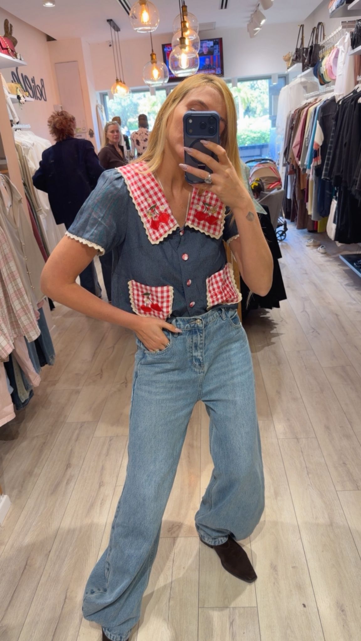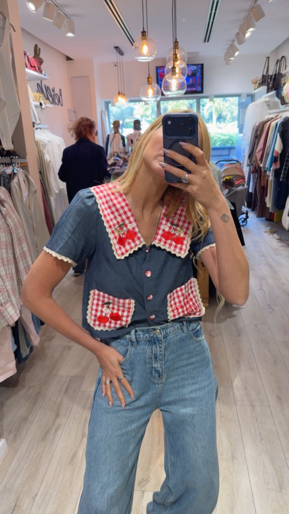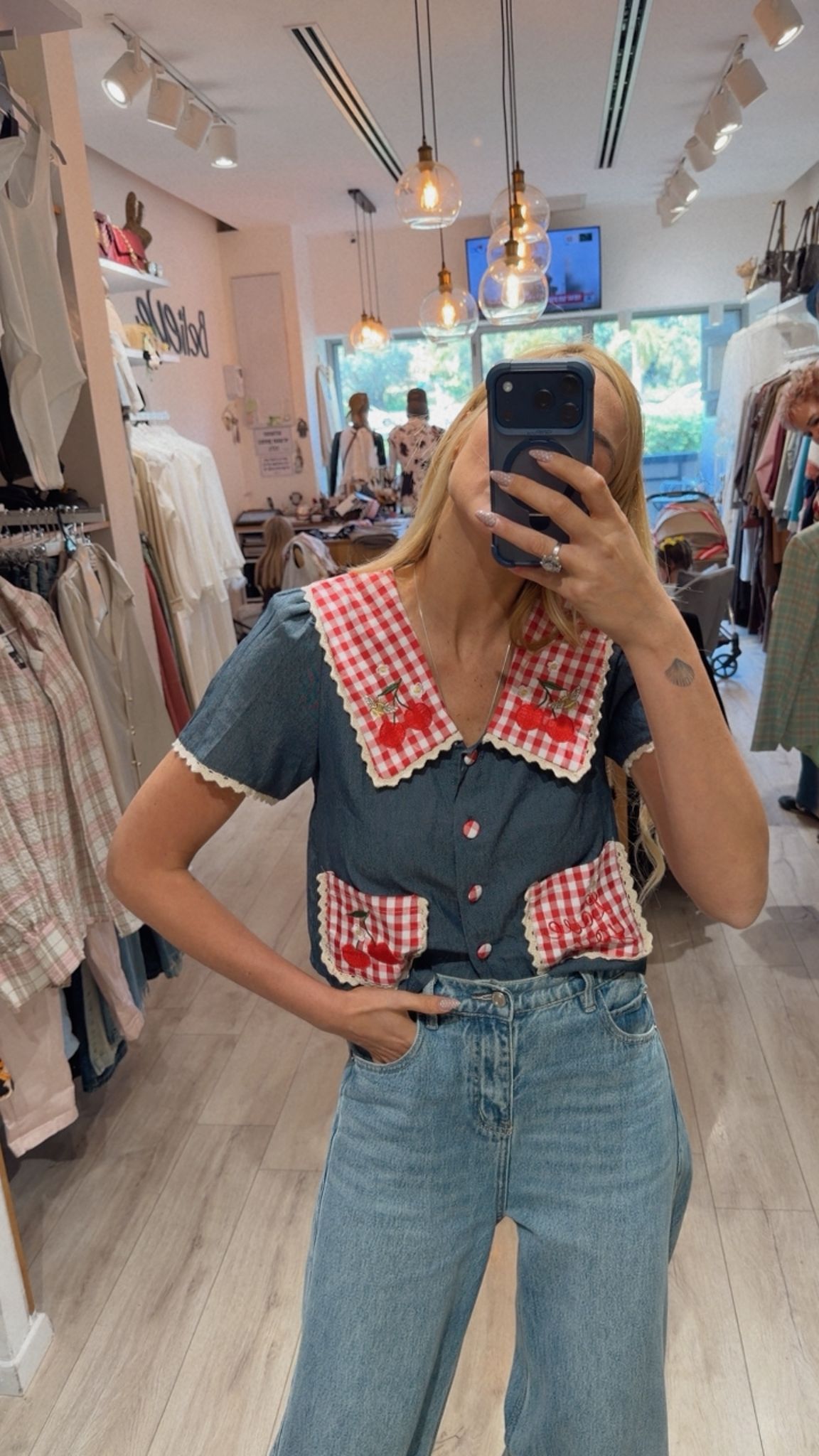 חולצה מבד ג'ינס צווארון גדול משובץ עם איורים של דובדבנים שני כיסים גדולים קדמיים משובצים ארבעה כפתורים משובצים מידה: וואן סייז