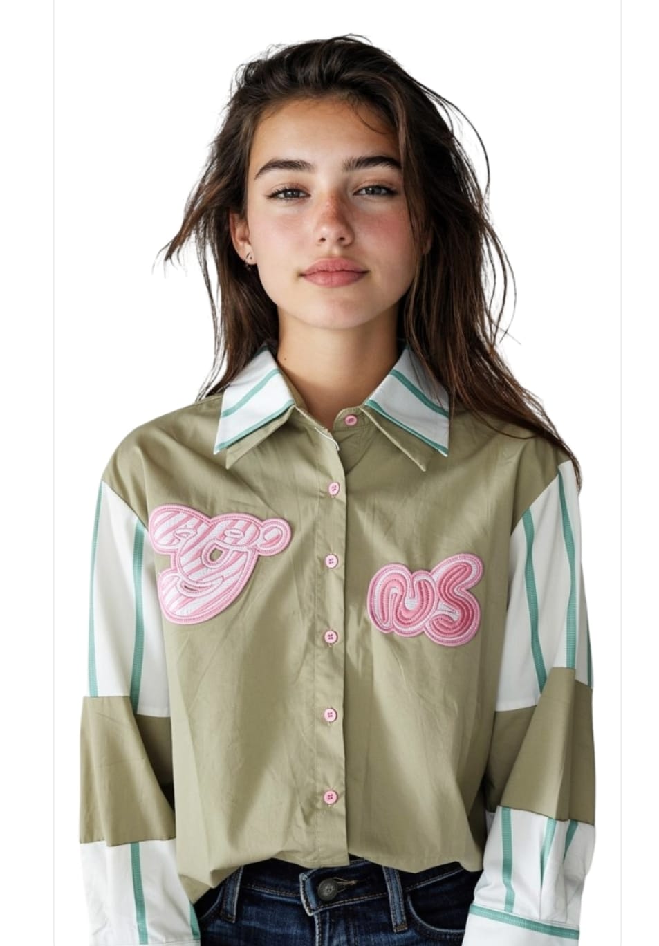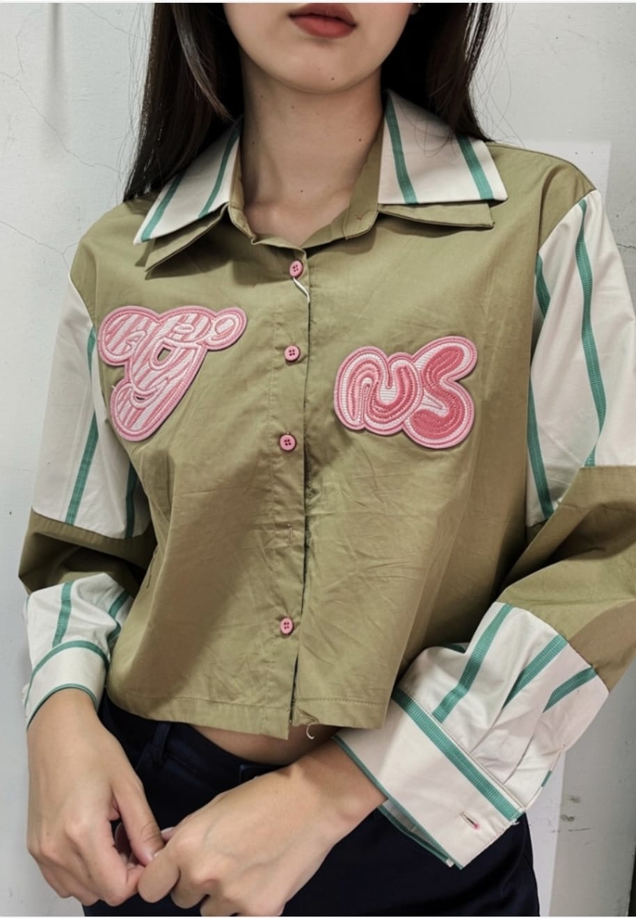 חולצת קרופ מכופתרת בצבע ירוק זית עם טלאים ורודים מקדימה מידה: וואן סייז