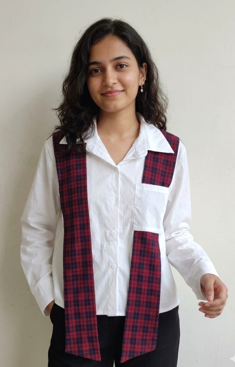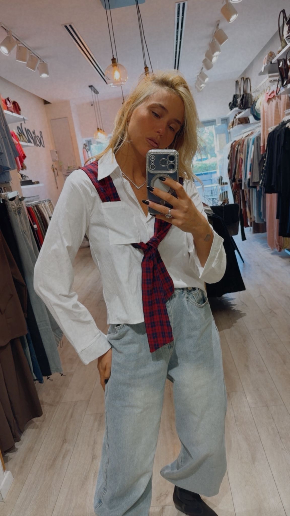 חולצה מכופתרת לבנה מבד כותנה מחובר לחולצה צעיף משובץ מידה: וואן סייז