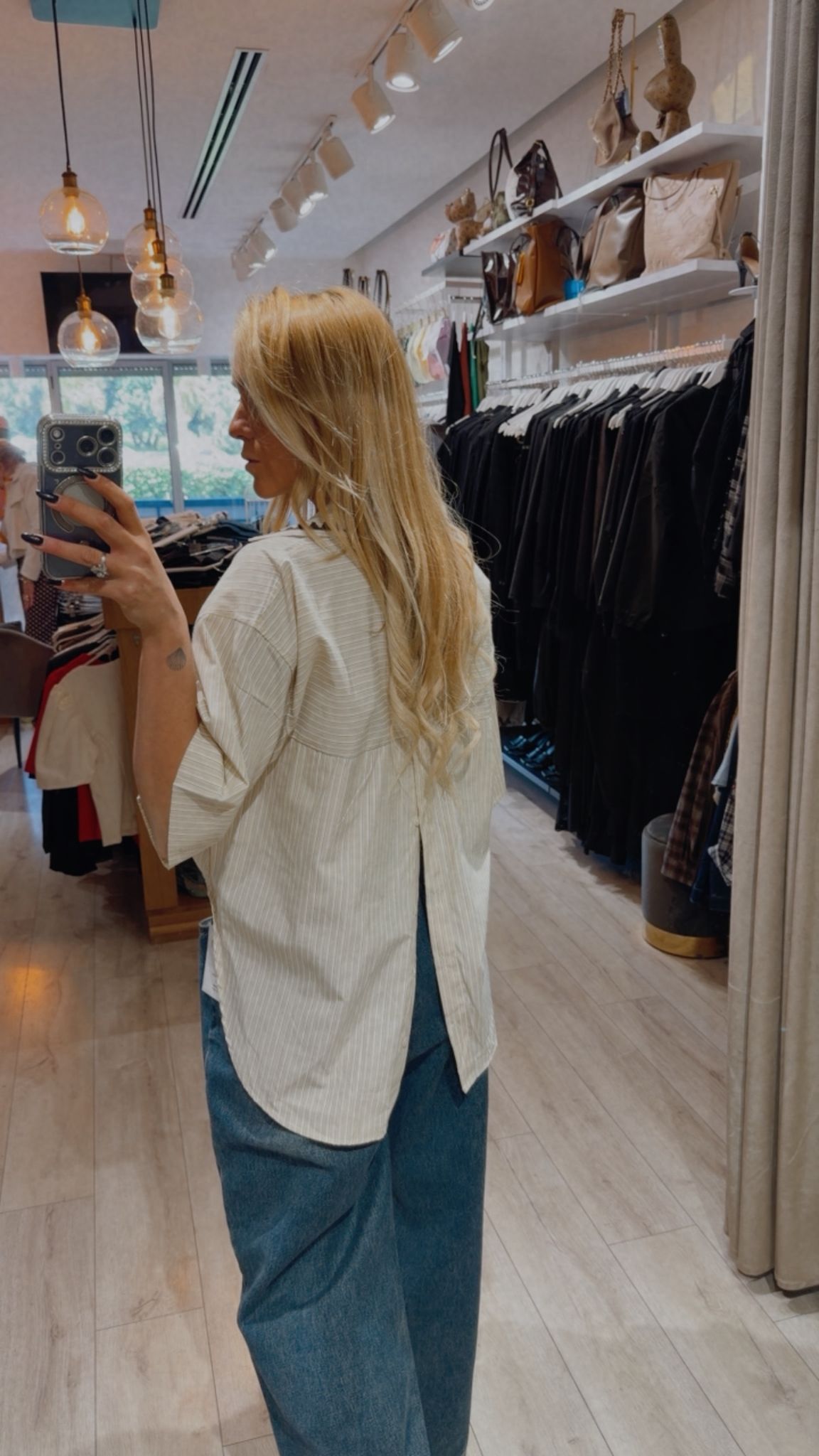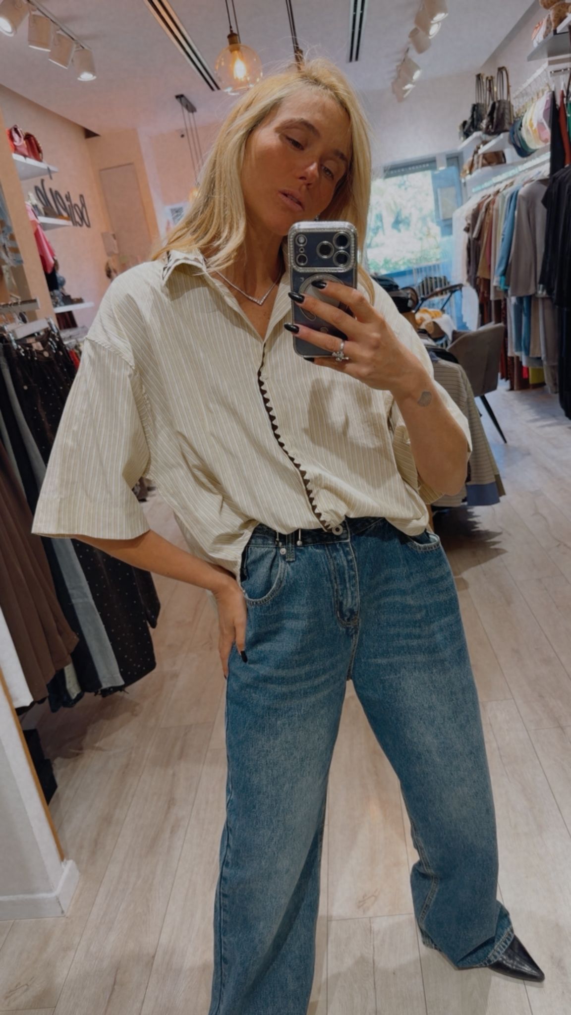 חולצה מכופתרת פסים עדינים שרוול קצר רקמה בצווארון ולאורך הכפתורים מידה: וואן סייז
