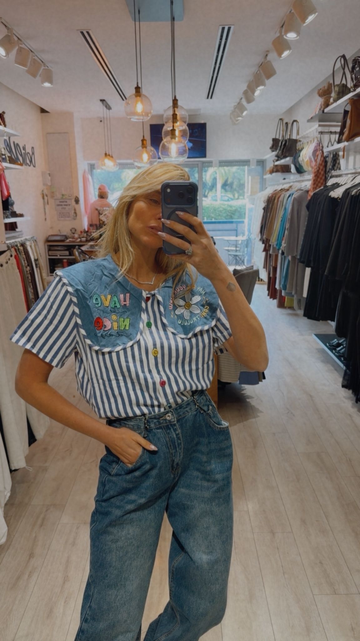חולצה מבד ג'ינס קצרה פסים לאורך צווארון גדול עם כיתוב וציורים עליו כפתורים בשלל צבעים מידה: וואן סייז