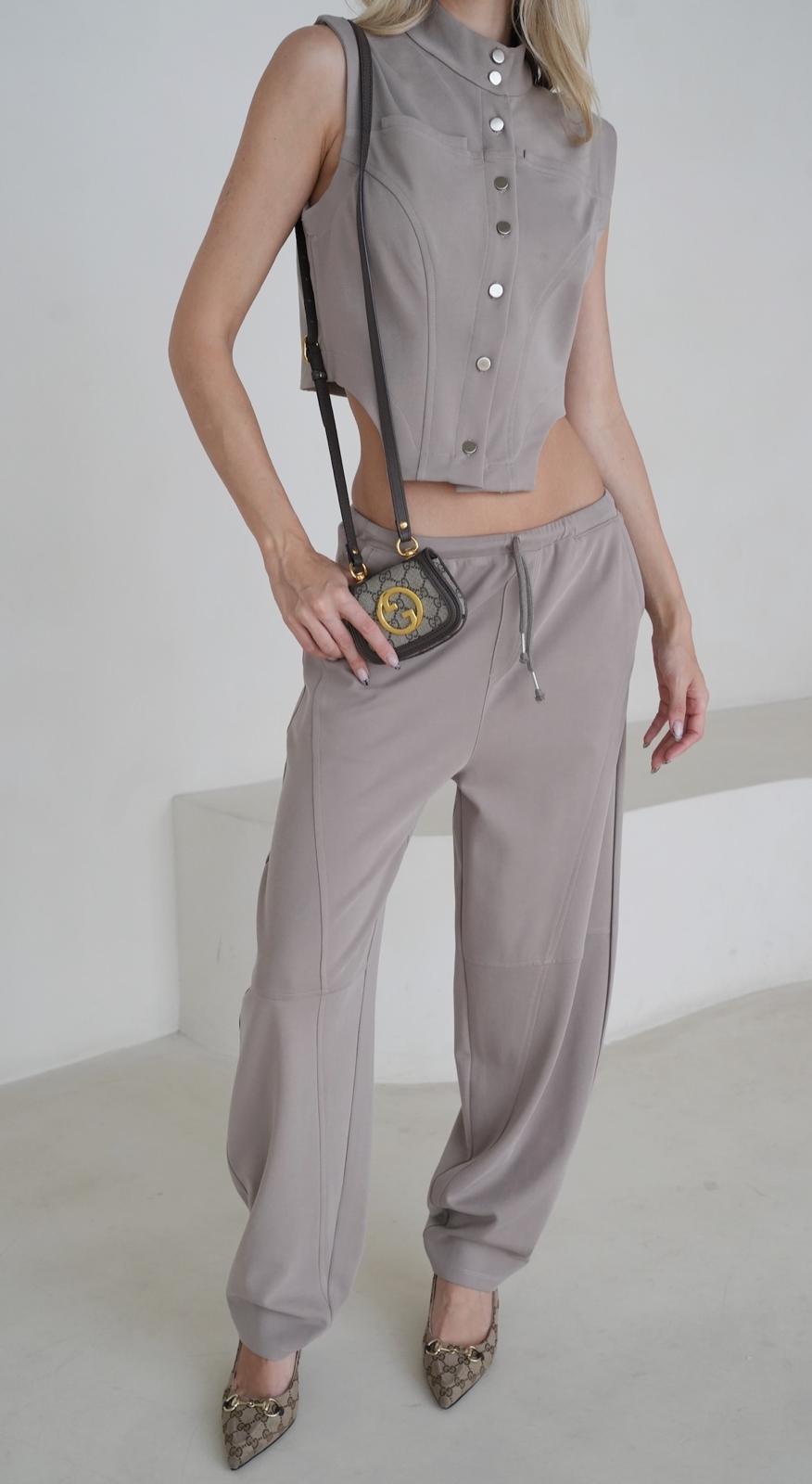חליפת 2 חלקים וסט מחויט בגזרת קרופ עם חיתוך א-סימטרי מכנסיים רחבים עם גומי שרוך במותן בד איכותי