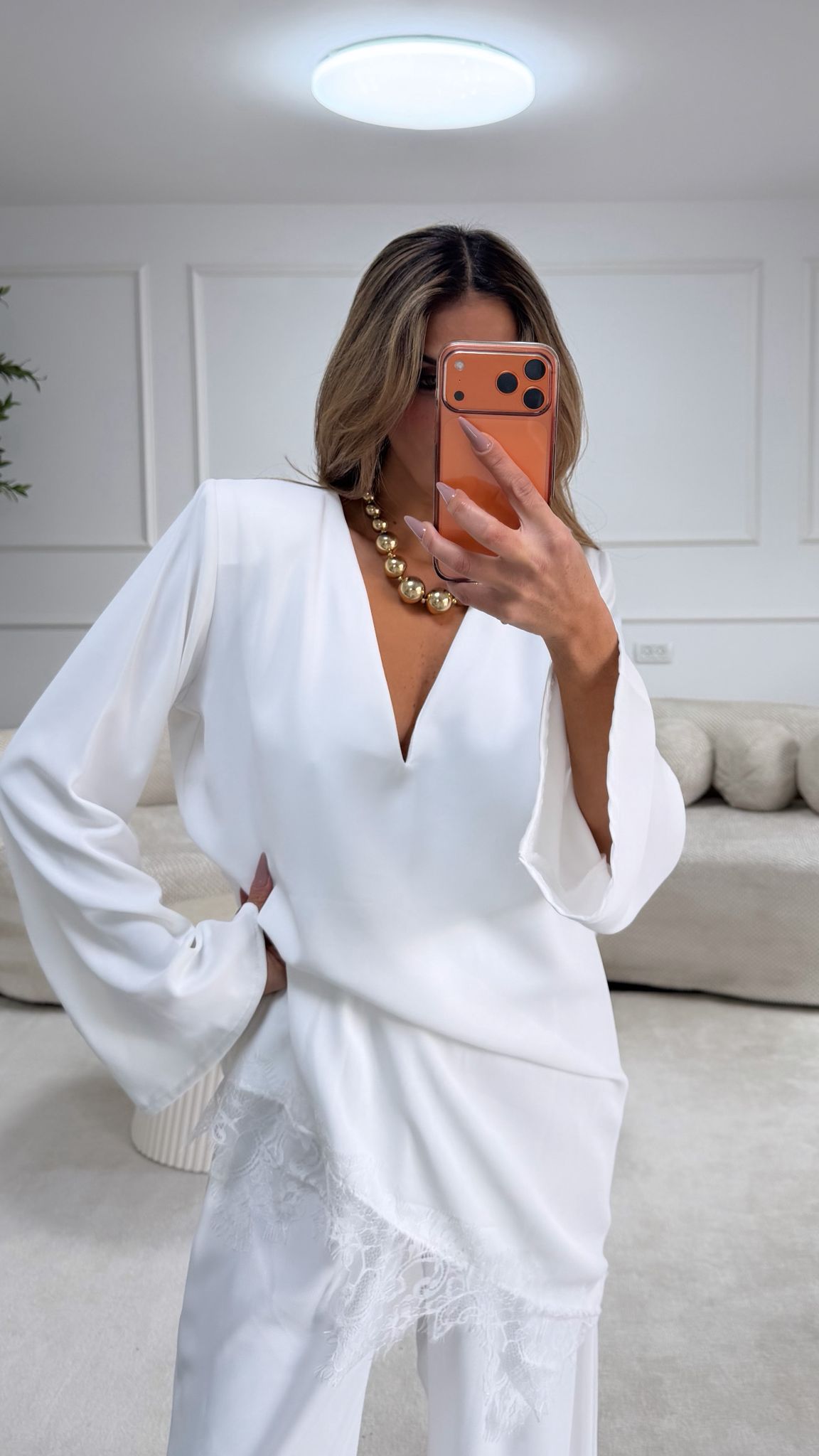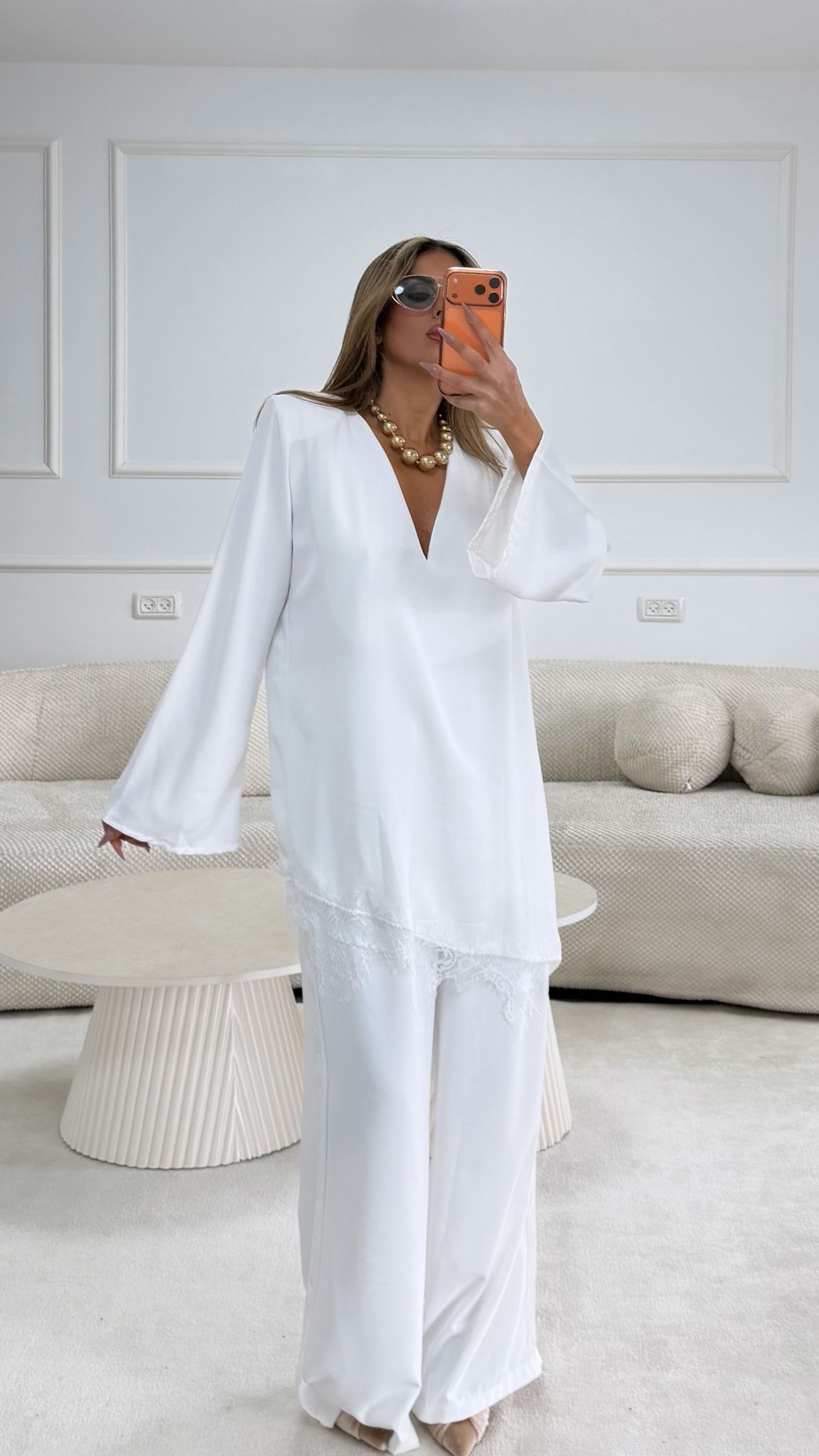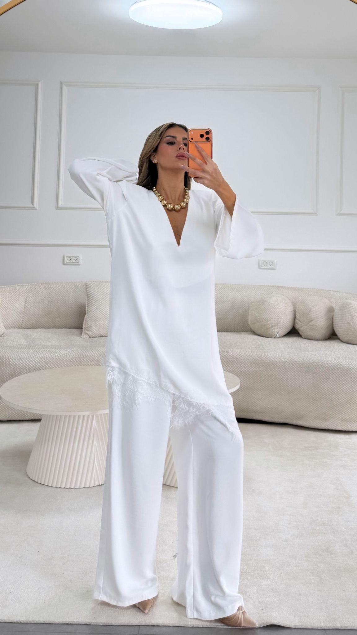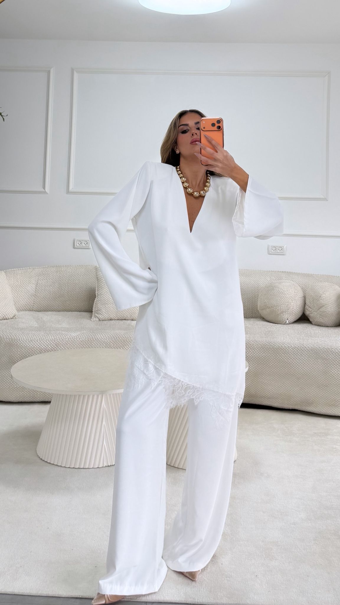 חליפת מכנס אלגנטית, חולצת טוניקה עם גימור פס תחרה מידה: וואן סייז מתאים עד מידה 44