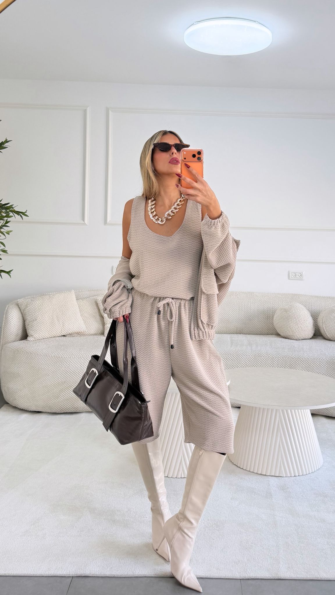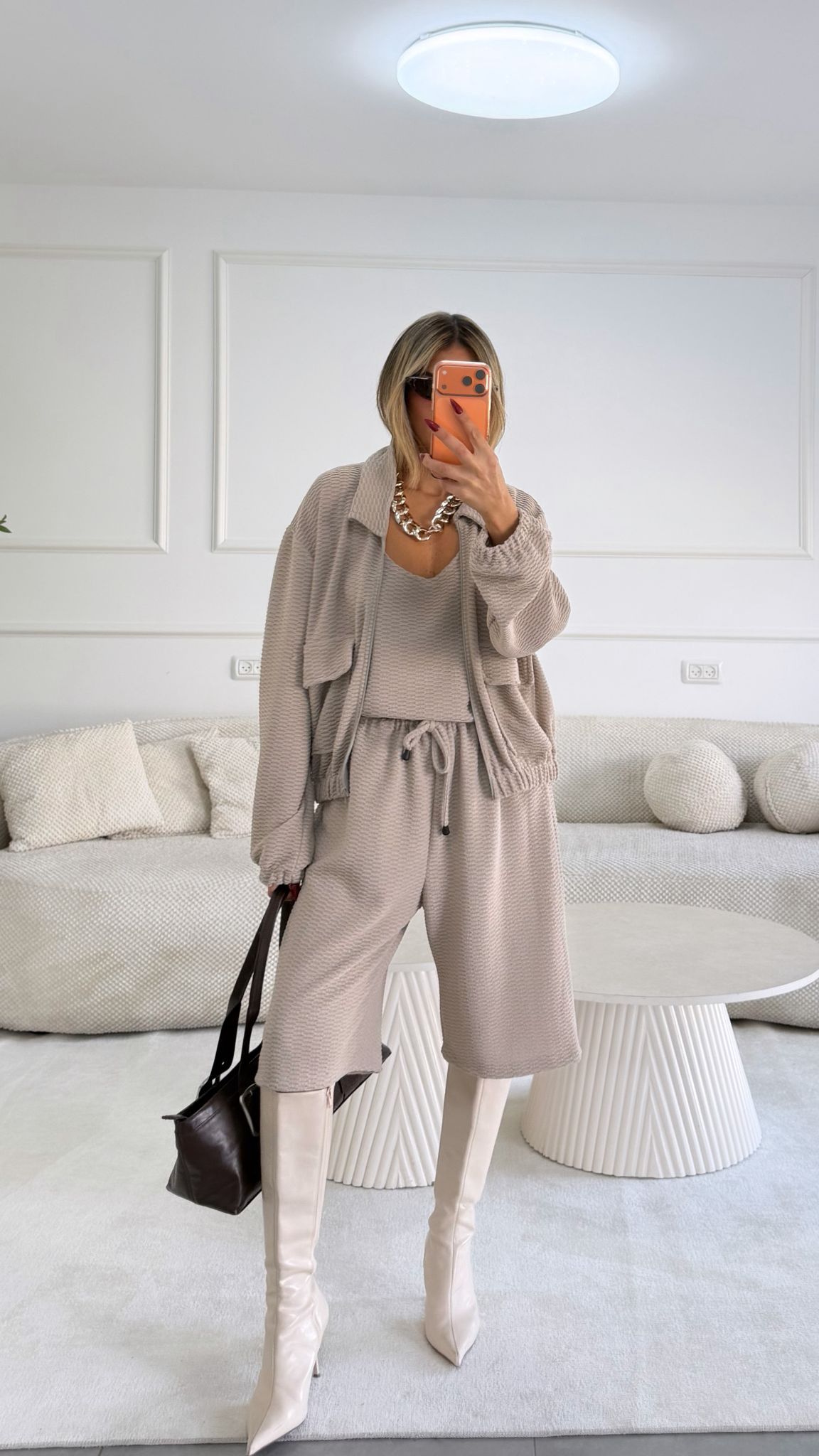 חליפת שלושה חלקים מבד וופל מכנס ברמודה גומי ושרוך במותן גופיה לוס, ג'קט עם רוכסן מידה: וואן סייז
