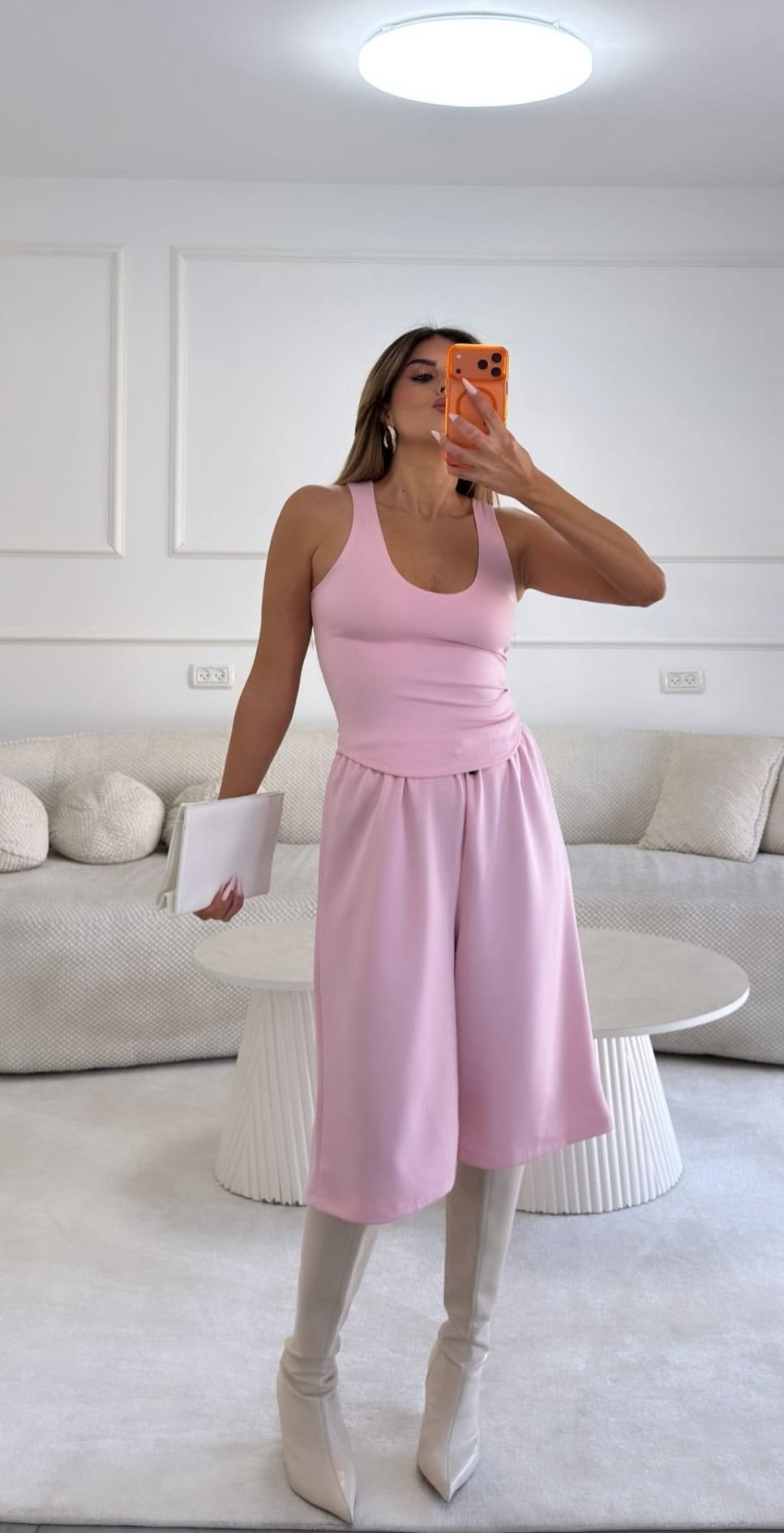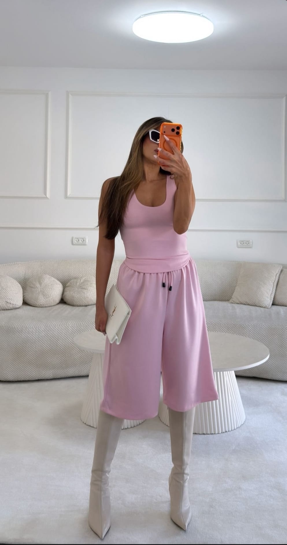 חליפת 2 חלקים מבד כותנה פרנץ טרי מכנסי ברמודה רחבים עם גומי במותן וגופיה תואמת עם כתפיות רחבות מידה: וואן סייז מתאימה עד מידה 42