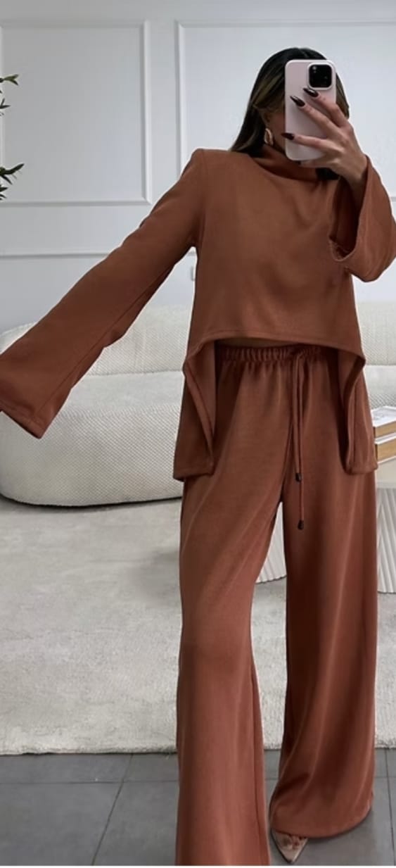 חליפה מבד סריג דק ונעים חולצה אסימטרית קצרה מקדימה ארוכה מאחור כריות בכתפיים מכנס לוס נשפך עם גומי במותן וחוט לקשירה מידה : וואן סייז