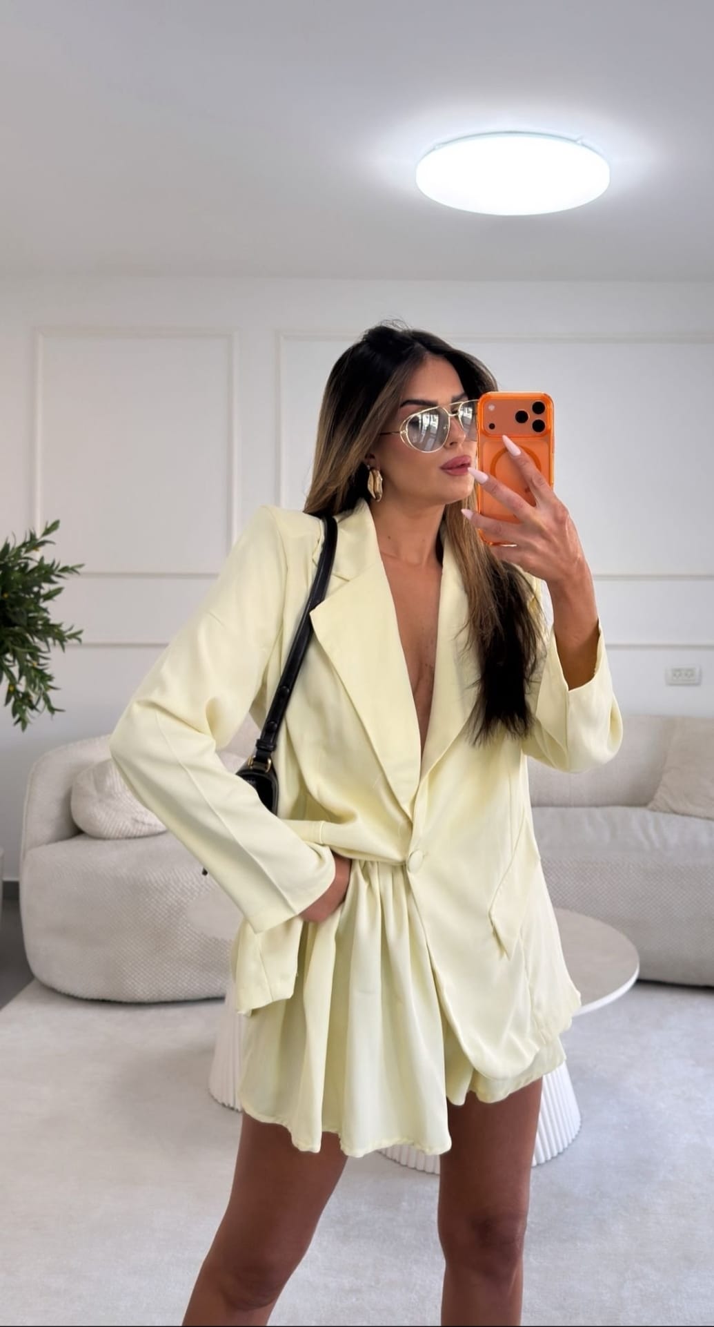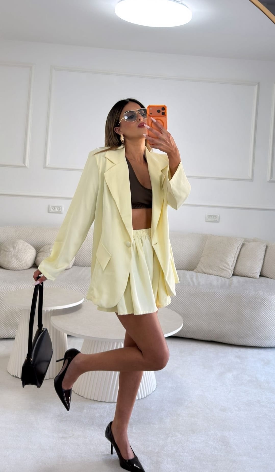 חליפת שני חלקים בלייזר אובר סייז עם כתפיות בכתפיים מכנסי חצאית עם גומי במותן מידה: וואן סייז מתאים עד מידה 42