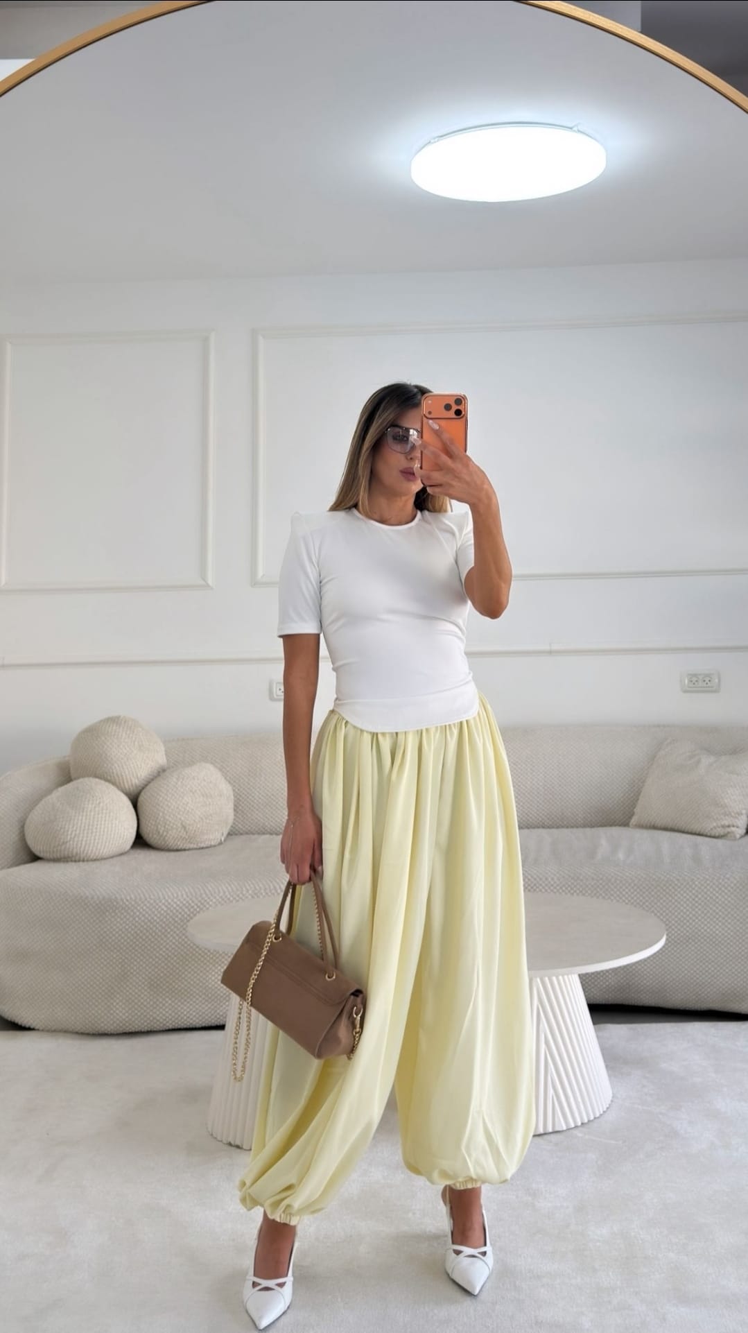 מכנס בגזרת בלון עם גומי בסיומת הרגל ובמותן מידה: וואן סייז