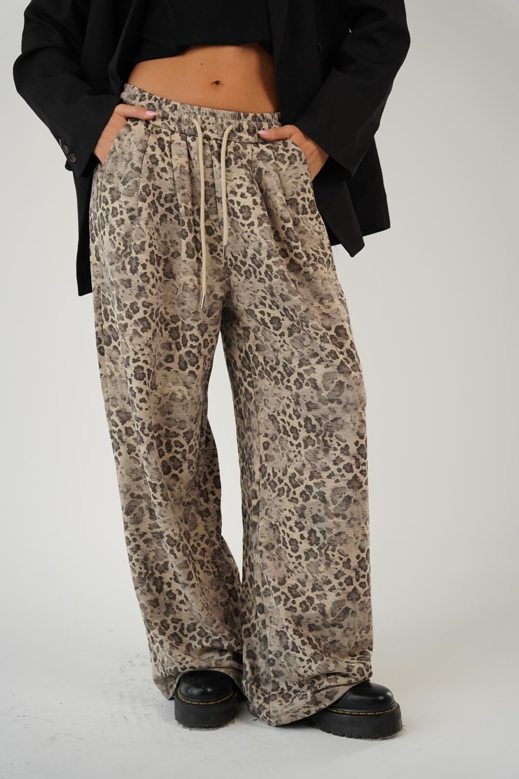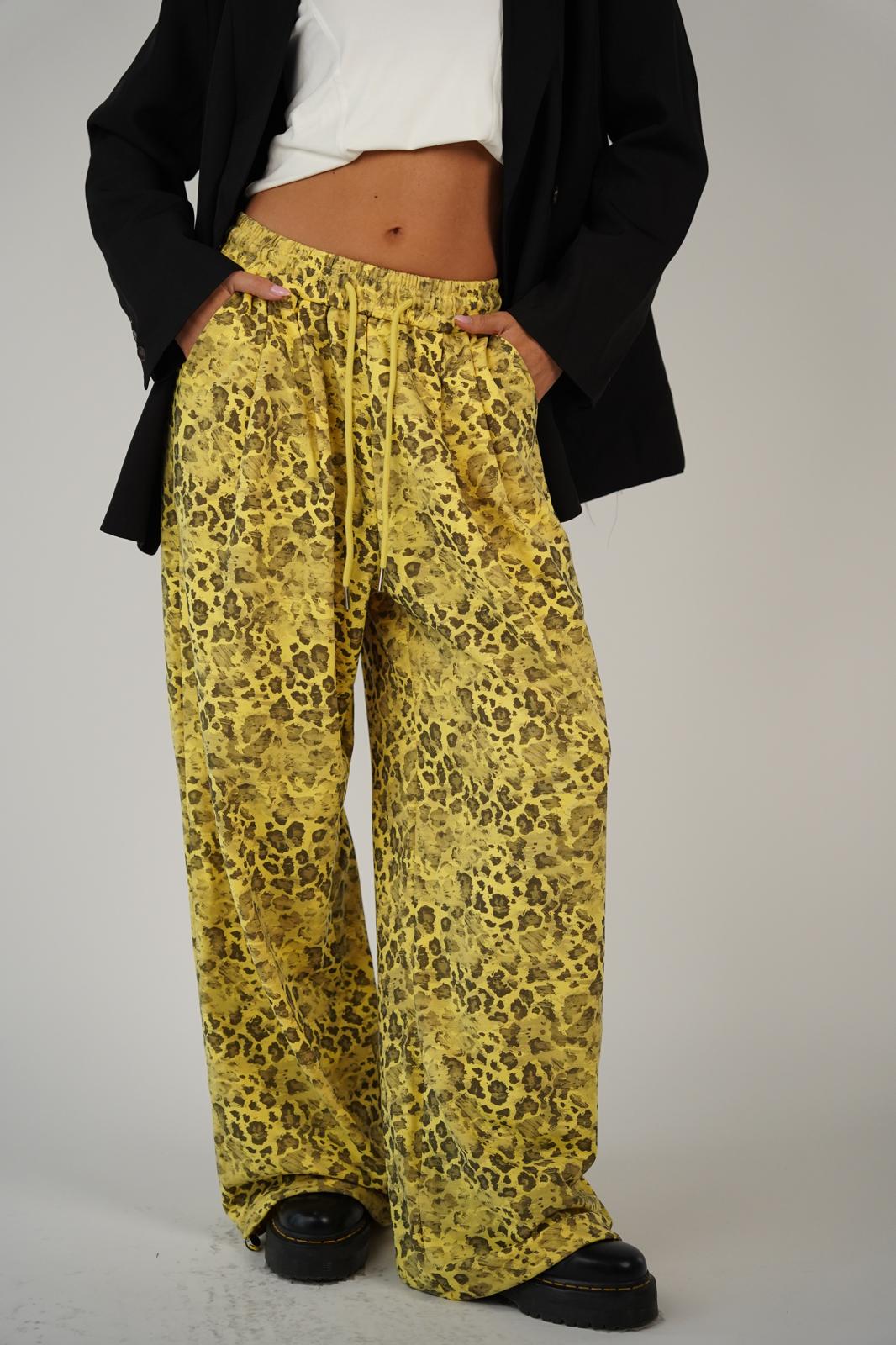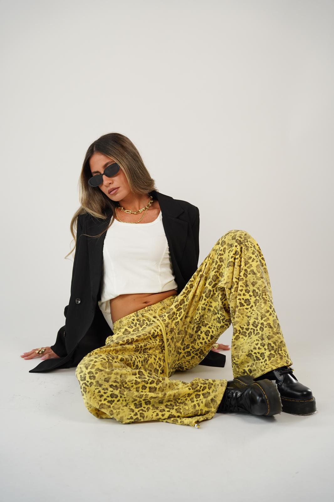 תיאור: מכנס מנומר עם גומי בגזרה משוחררת אוברסייז צבעים: מנומר צהוב ומנומר בז׳ מידה: וואן סייז