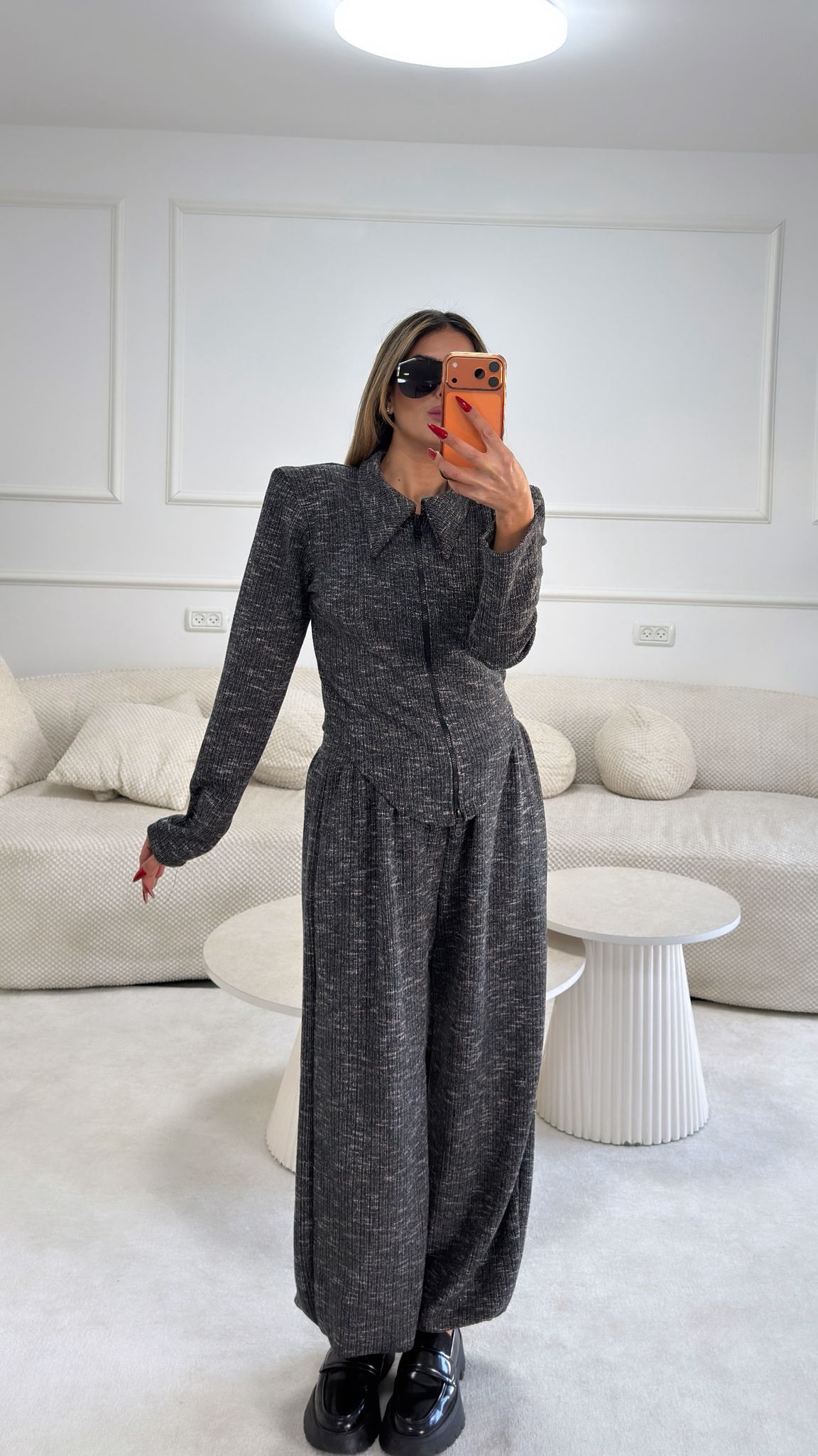 חליפת 2 חלקים בד קליל עם טקסטורת פסים טופ קרדיגן עם סגירת רוכסן שנפתח משני הכיוונים מכנס בלון בסיומת גומי, כיסים בצדדים מידה: וואן סייז