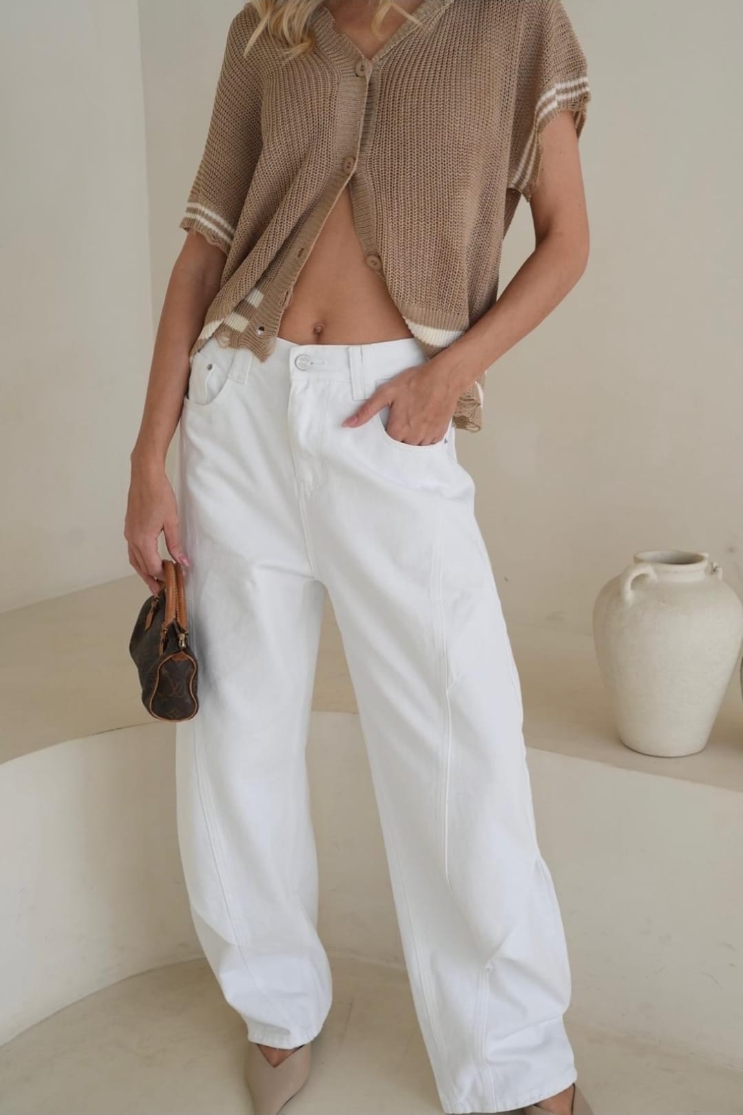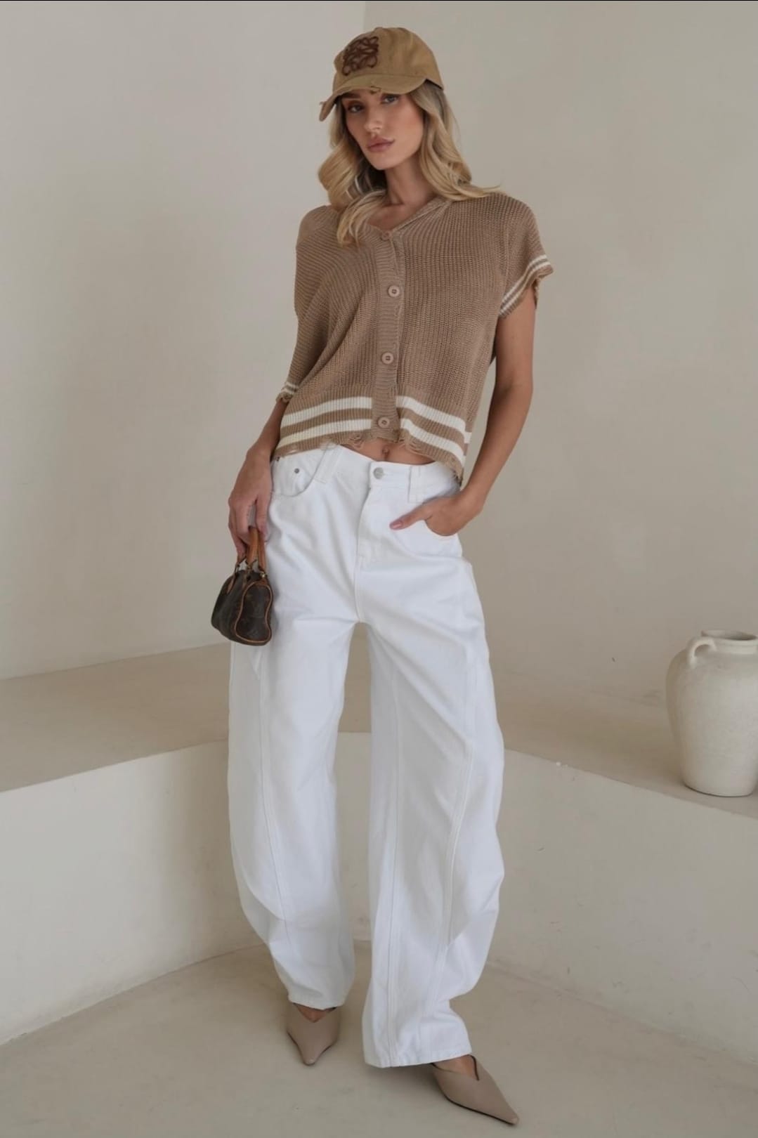 סריג קליל עם שרוול קצר המשלב קפוצ'ון סגירת כפתורים קדמית גימור פרום במכפלת ובשרוולים מידה: וואן סייז