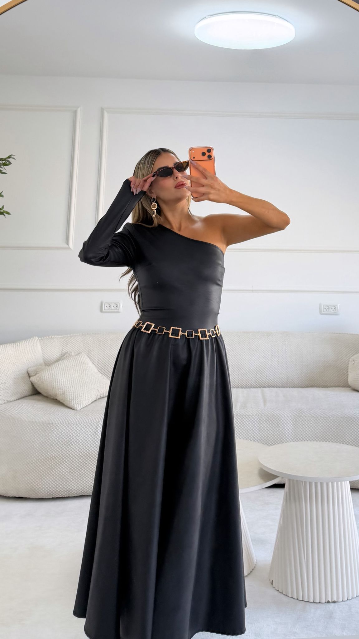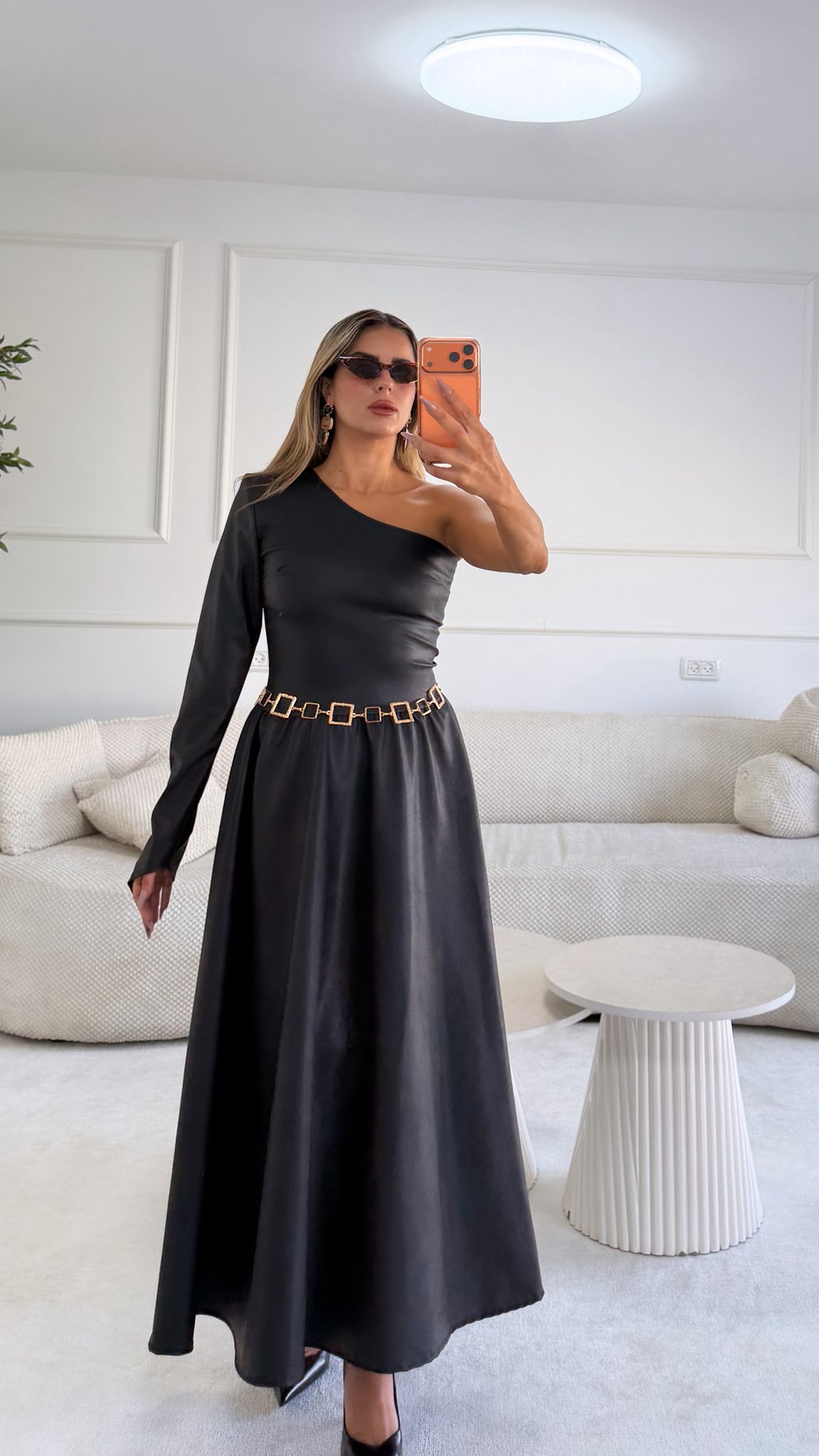 שמלת מקסי בד דמוי עור אסימטרית, בעלת שרוול אחד " מגיעה ללא החגורה" מידה: וואן סייז